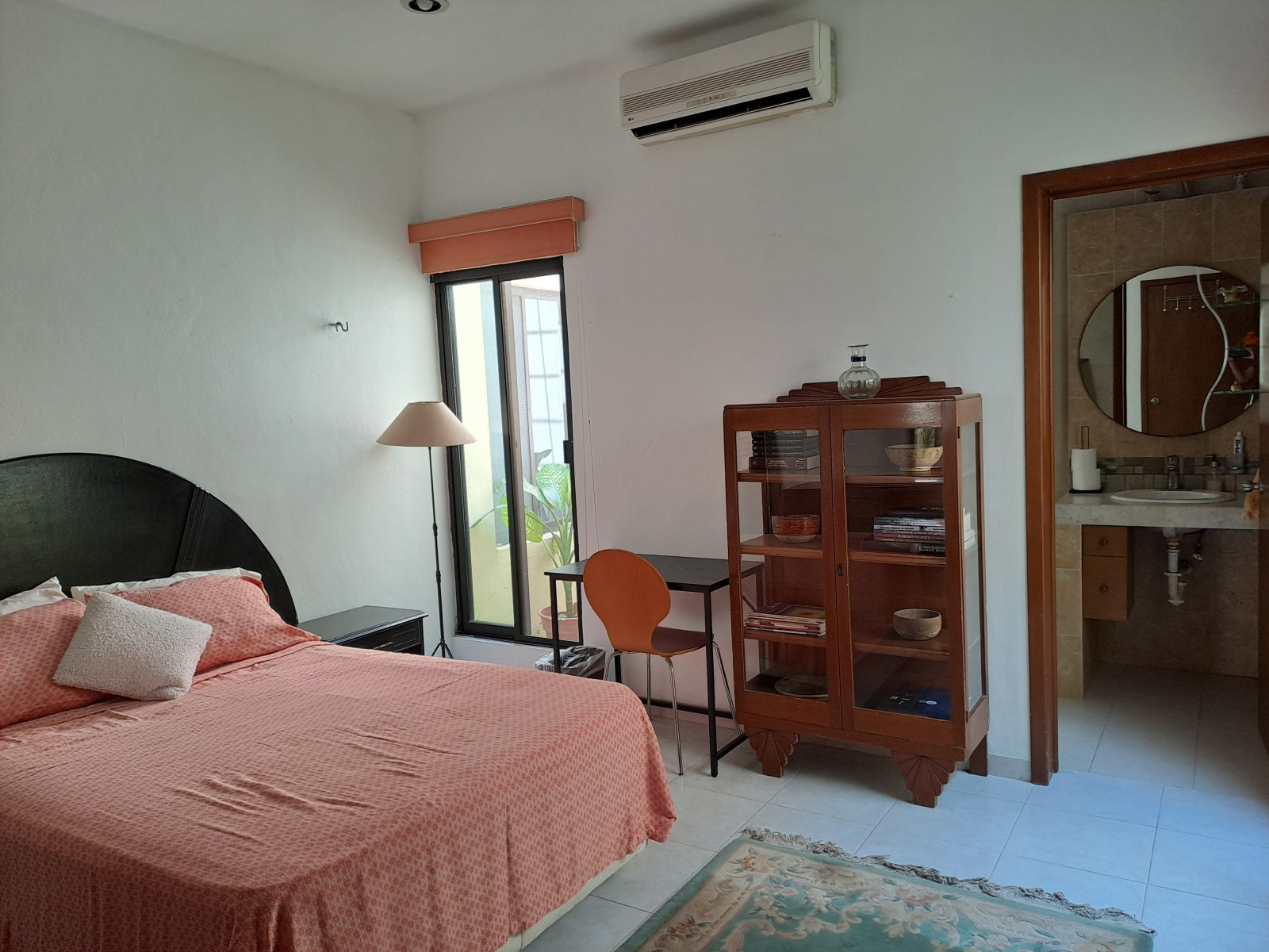 Cama matrimonial, librero y mesa multiusos, jardín interior.