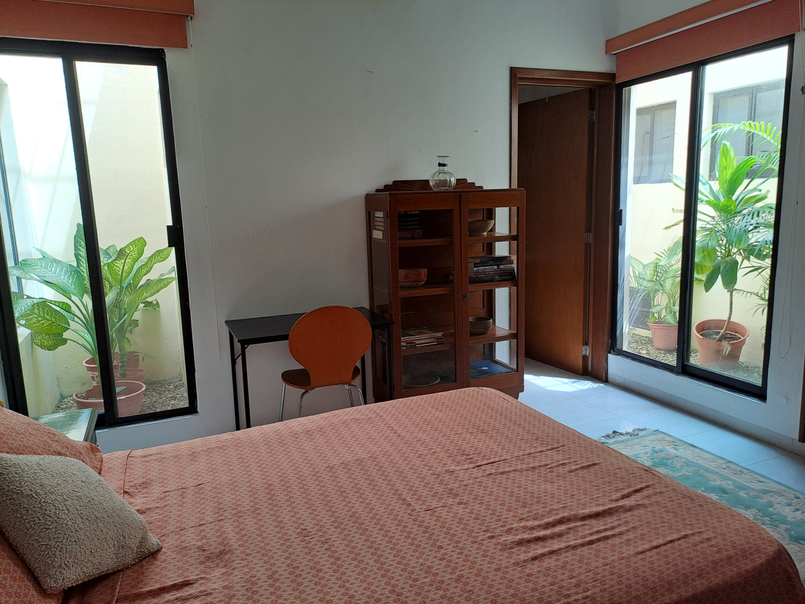 Cama, entrada al baño privado, jardín interior, librero y mesa multifuncional